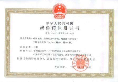 經(jīng)過科研人員的共同努力,公司于2011年1月19日獲得雞新城疫、傳染性支氣管炎、禽流感(H9亞型)三聯(lián)苗滅活疫苗(La Sota株+M41株+SS株)新獸藥證書。