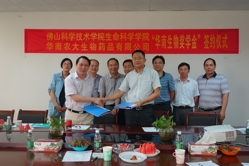 2014年5月21日上午,“華南生物獎學金”簽約儀式在華南生物公司順利舉行。佛山科學技術(shù)學院生命科學學院院長王丙云教授、黨委曾強副書記、辦公室黃興國主任、王政富副教授及華南生物公司總經(jīng)理梁昭平、副總經(jīng)理王斌、副總經(jīng)理肖長賞、技術(shù)服務(wù)總監(jiān)薛素強、行政拓展部經(jīng)理許芬芬等出席了簽約儀式。王丙云院長與粱昭平總經(jīng)理代表雙方在合作協(xié)議上簽字。