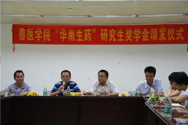 活動首先由梁梓森書記代表學(xué)院致辭,衷心感謝廣州市華南農(nóng)大生物藥品有限公司在獸醫(yī)學(xué)院設(shè)立研究生獎學(xué)金勉勵獸醫(yī)學(xué)子勤奮學(xué)習(xí)、進(jìn)取有為,并對獲獎同學(xué)表示祝賀,希望同學(xué)們能再接再厲,不辜負(fù)企業(yè)與學(xué)院的期望。此外,梁書記還結(jié)合華南生藥兩位總經(jīng)理的創(chuàng)業(yè)經(jīng)歷給大家上了一堂簡短生動的創(chuàng)業(yè)培訓(xùn)課,在啟發(fā)同學(xué)們開拓個人發(fā)展的同時也祝愿華南生藥公司的發(fā)展越來越好。企業(yè)代表梁昭平總經(jīng)理向大家介紹了華南農(nóng)大生物藥品有限公司的基本情況,并介紹了企業(yè)來學(xué)院設(shè)立獎學(xué)金的初衷是以關(guān)注研究生個人發(fā)展為出發(fā)點,通過設(shè)立獎學(xué)金為紐帶增進(jìn)校企間的科技、文化交流,進(jìn)而深化產(chǎn)學(xué)研合作的形式,實現(xiàn)校企優(yōu)勢互補(bǔ)、互利共贏,希望同學(xué)們以獲得獎學(xué)金資助為鞭策,加倍努力規(guī)劃好自己的學(xué)業(yè)和能力。