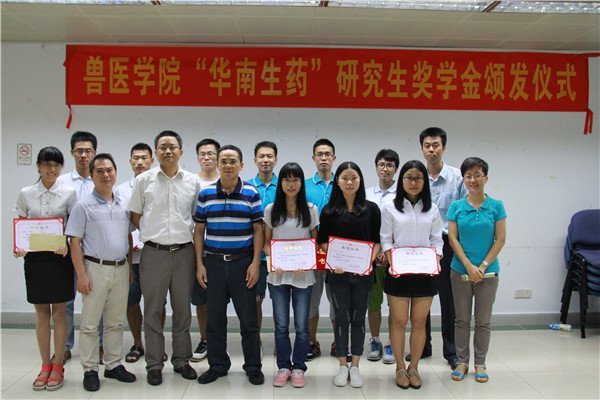 2015年6月24日下午3:30,“華南生藥”研究生獎學(xué)金頒獎暨揭牌儀式在農(nóng)業(yè)部畜禽產(chǎn)品質(zhì)量監(jiān)督檢驗測試中心101報告廳舉行。廣州市華南農(nóng)大生物藥品有限公司梁昭平總經(jīng)理、營銷中心黃國城副總經(jīng)理、公司技術(shù)部李敏經(jīng)理、行政拓展部許芬芬經(jīng)理、我校獸醫(yī)學(xué)院黨委書記梁梓森、黨委副書記楊利江、輔導(dǎo)員陳曉梅老師、全體獲獎學(xué)生和學(xué)生代表出席并參加了掛牌儀式和頒獎典禮。