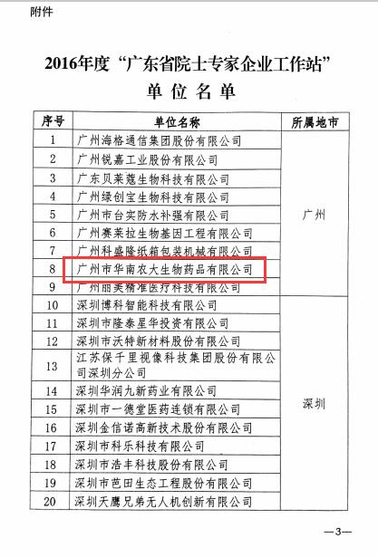 為貫徹落實(shí)《中共廣東省委 廣東省人民政府關(guān)于加強(qiáng)新時(shí)期科協(xié)工作的意見》(粵發(fā)[2013]2號(hào))精神,充分發(fā)揮科協(xié)系統(tǒng)的組織網(wǎng)絡(luò)、人才智力和科學(xué)技術(shù)優(yōu)勢(shì),進(jìn)一步加快實(shí)施創(chuàng)新驅(qū)動(dòng)發(fā)展戰(zhàn)略,將院士、專家等高端人才引入企業(yè),幫助企業(yè)解決技術(shù)難題,培養(yǎng)科技創(chuàng)新人才,促進(jìn)產(chǎn)學(xué)研合作,提高企業(yè)核心競(jìng)爭(zhēng)力,依據(jù)《廣東省“院士專家企業(yè)工作站”管理辦法(試行)》的規(guī)定,經(jīng)有關(guān)單位申請(qǐng)、地方科協(xié)推薦、實(shí)地考察調(diào)研,省科協(xié)決定在廣州市華南農(nóng)大生物藥品有限公司等44家單位建立“廣東省院士專家企業(yè)工作站”。建站期為2016年12月至2019年12月。