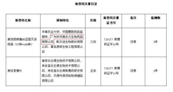 根據(jù)《獸藥管理?xiàng)l例》和《獸藥注冊(cè)辦法》規(guī)定,經(jīng)審查,批準(zhǔn)華南農(nóng)業(yè)大學(xué)等9家單位申報(bào)的禽流感病毒H5亞型滅活疫苗(D7株+rD8株)等2種產(chǎn)品為新獸藥,核發(fā)《新獸藥注冊(cè)證書》,并發(fā)布產(chǎn)品試行規(guī)程、質(zhì)量標(biāo)準(zhǔn)、說明書和標(biāo)簽,自發(fā)布之日起執(zhí)行。