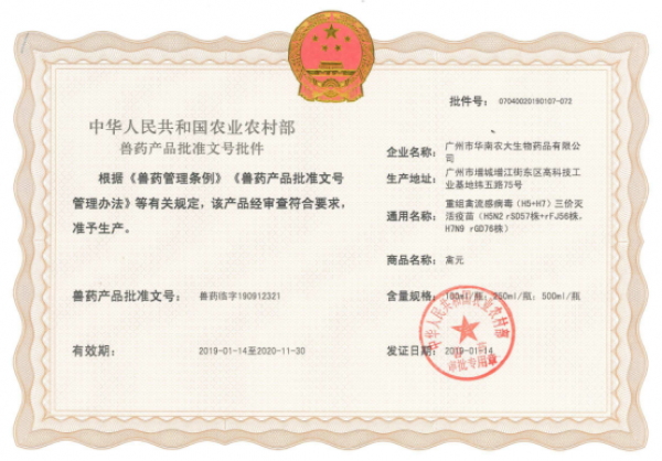 2019年1月14日,由華南農(nóng)業(yè)大學(xué)、中國獸醫(yī)藥品監(jiān)察所、廣州市華南農(nóng)大生物藥品有限公司(以下簡稱“華南生物”)共同研制的重組禽流感病毒(H5+H7)三價(jià)滅活疫苗(H5N2 rSD57株+rFJ56株,H7N9 rGD76株)通過農(nóng)業(yè)部獸藥產(chǎn)品批準(zhǔn)文號(hào)的審批,喜獲得農(nóng)業(yè)部核發(fā)的獸藥產(chǎn)品批準(zhǔn)文號(hào)——獸藥生字190912321;商品名:禽元。