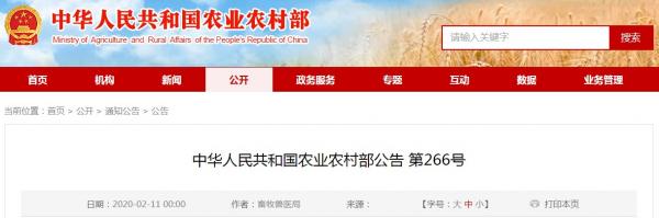 信息來源:中華人民共和國農(nóng)業(yè)農(nóng)村部公告 第266號