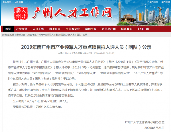 2019年度廣州市產業(yè)領軍人才重點項目擬入選人員(團隊)公示鏈接: