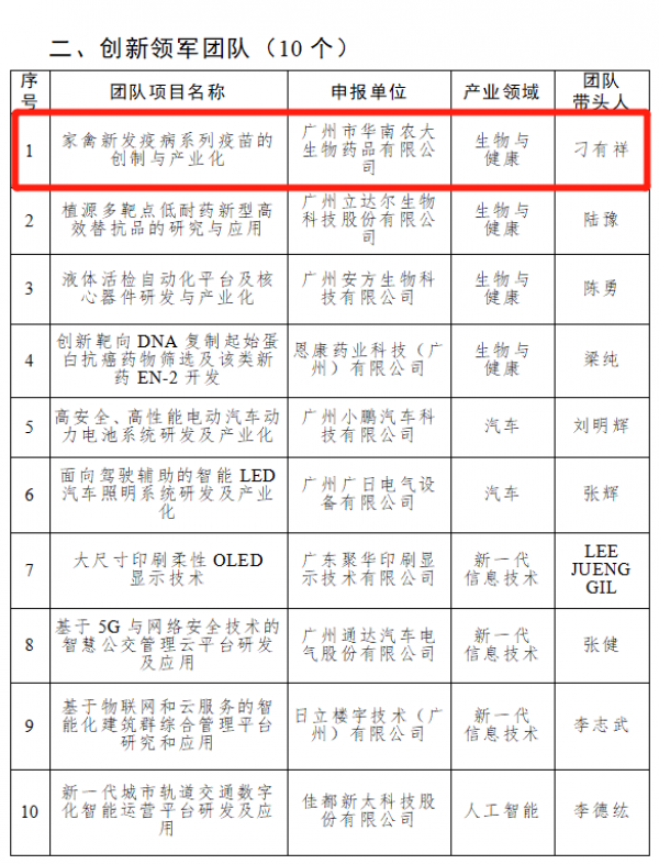 5月23日,2019年度廣州市產業(yè)領軍人才重點項目擬入選人員(團隊)公示,按照關于加快集聚產業(yè)領軍人才的意見相關規(guī)定,經申報評審各項程序,廣州市華南農大生物藥品有限公司擬入選“2019年度廣州市創(chuàng)新領軍團隊”。
