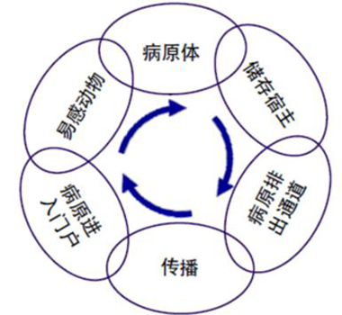 病原微生物必須有足夠數(shù)量與易感宿主家禽接觸,才能使該病原引起的疾病在易感家禽間擴散。為了感染家禽,病原微生物必須與動物有足夠的接觸(傳染壓力)。同時,病原體必須能具有傳染性才能可通過直接接觸(雞與雞)和/或間接接觸(經(jīng)由污染的設(shè)備、環(huán)境等)和/或通過攜帶者進行傳播。蟲類、鳥類、其他動物或一些有機物可作為某些病原的儲存宿主(例如飼料和糞水),使病原持續(xù)存在。對傳染鏈(圖1)的一個或幾個環(huán)節(jié)有實質(zhì)性影響的行為都會降低疾病傳播的風險。