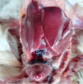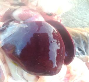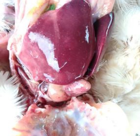 本場爆發(fā)的雞霍亂病例中多為急性病例,雞群并未見明顯的臨床癥狀,多數(shù)雞突然死亡。少部分雞精神倦怠、離群呆立,少見甩頭癥狀。病雞排黃綠色稀糞,呼吸加快。體重較大的雞死亡率較高,剖檢可見鼻腔有泡沫狀粘液,雞冠蒼白水腫;氣管有卡他性滲。心臟脂肪和外膜出血,肝臟有明顯的白色壞死點;十二指腸粘膜紅腫。肝臟病變見下圖: