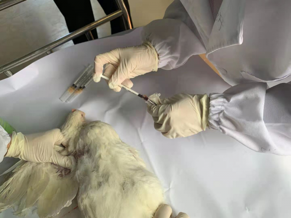 初學(xué)者往往找不到最好的下針位置,容易扎偏。建議采集者壓住皮膚不讓血管滑動(dòng),找準(zhǔn)部位下針,或者不從血管正上方下針而是讓針尖與血管走向呈一定的角度入針。入針后針頭的走向如果確定不好也不用著急,一旦回血可以暫且不繼續(xù)入針,而是保持姿勢(shì)直接抽取。抽血時(shí)若遇到血流抽取速度緩慢,不能心急,可以稍微旋轉(zhuǎn)針頭或極輕微地往外拔一下針頭。另外,最大采血量不超過雞體重的1%。