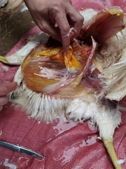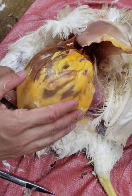 茂名某規(guī)?;半u場飼養(yǎng)蛋雞3棟,單棟1.5萬只。A棟雞從開產(chǎn)到230日齡產(chǎn)蛋率一直上不去,維持在85%左右。大群采食量和飲水正常,平均每只雞采食量為105g,大群精神狀況良好,糞便正常。臨床觀察發(fā)現(xiàn)個(gè)別雞只(30只左右)腹部膨大下垂,觸之有波動感。頭頸高舉,行走時(shí)呈企鵝狀姿勢。B棟和C棟無此情況。