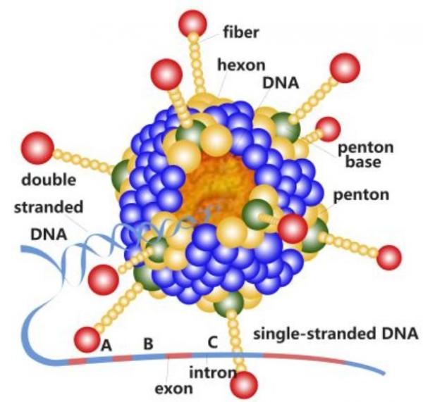 FAdV-Ⅰ為腺病毒科腺病毒屬病毒,無囊膜,直徑為70-90nm,呈20面體對稱結(jié)構(gòu)。表面由252個殼粒組成,包括240個六棱體和12個五棱體,每個五棱體有2條纖維突起。中間包著直徑60-65nm的髓蕊(雙股DNA和核蛋白),殼粒排列在三角形的面上,每邊6個殼粒。禽腺病毒具有2根長度相近的纖絲,纖絲的長度與抗原性有關(guān)。