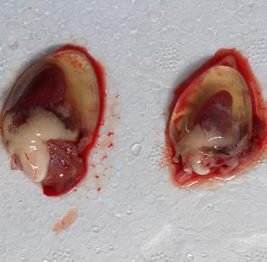 (2)心包積液綜合征:剖檢病變主要表現(xiàn)為心包腔內(nèi)有黃色清亮水樣或膠凍樣液體,心肌柔軟,有壞死點。肝臟腫大、質(zhì)脆易碎、有壞死灶;脾臟腫大;肺水腫、充血等。